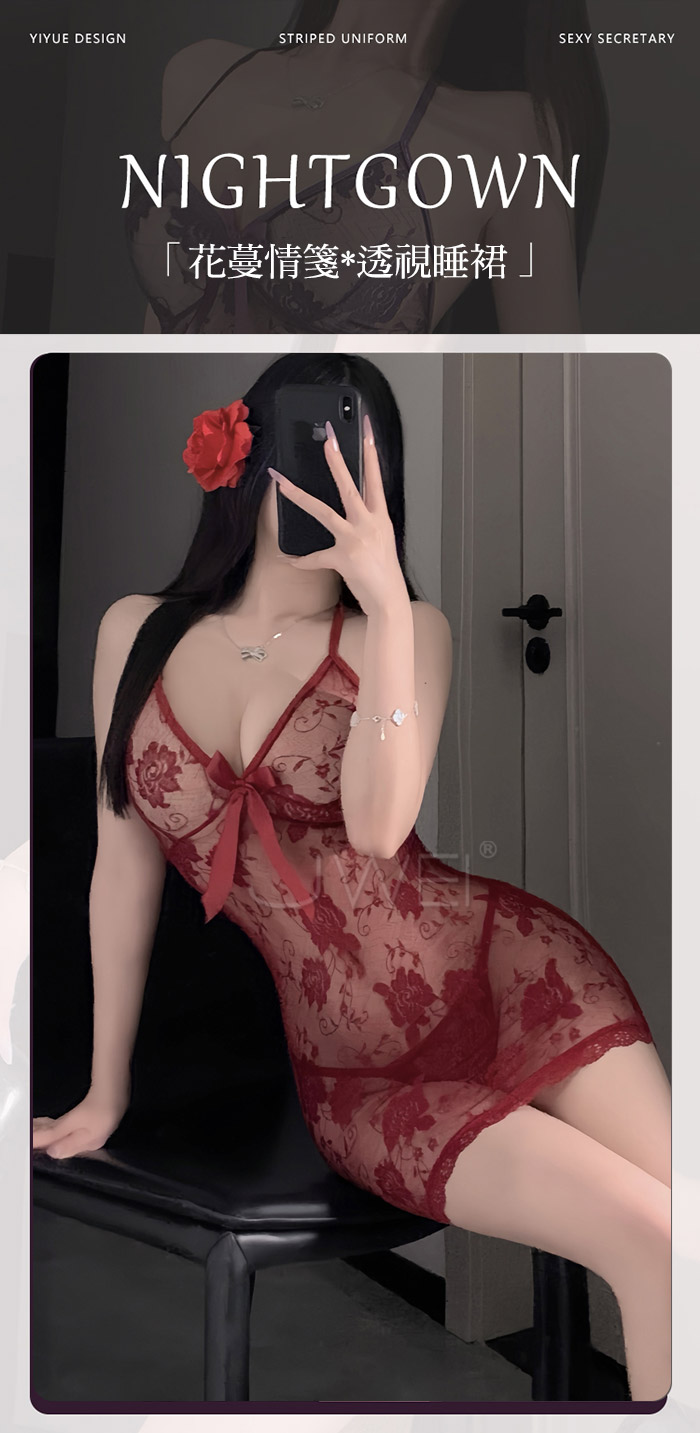 | 枕邊禁語.純欲花蔓薄紗透視睡裙-棗紅色【睡裙+T褲】