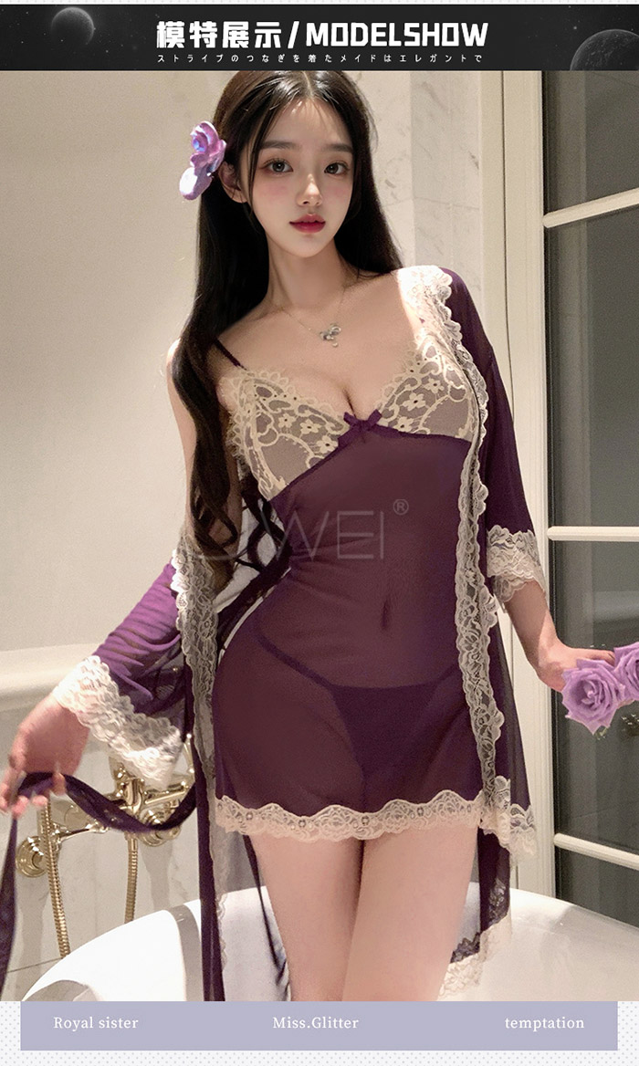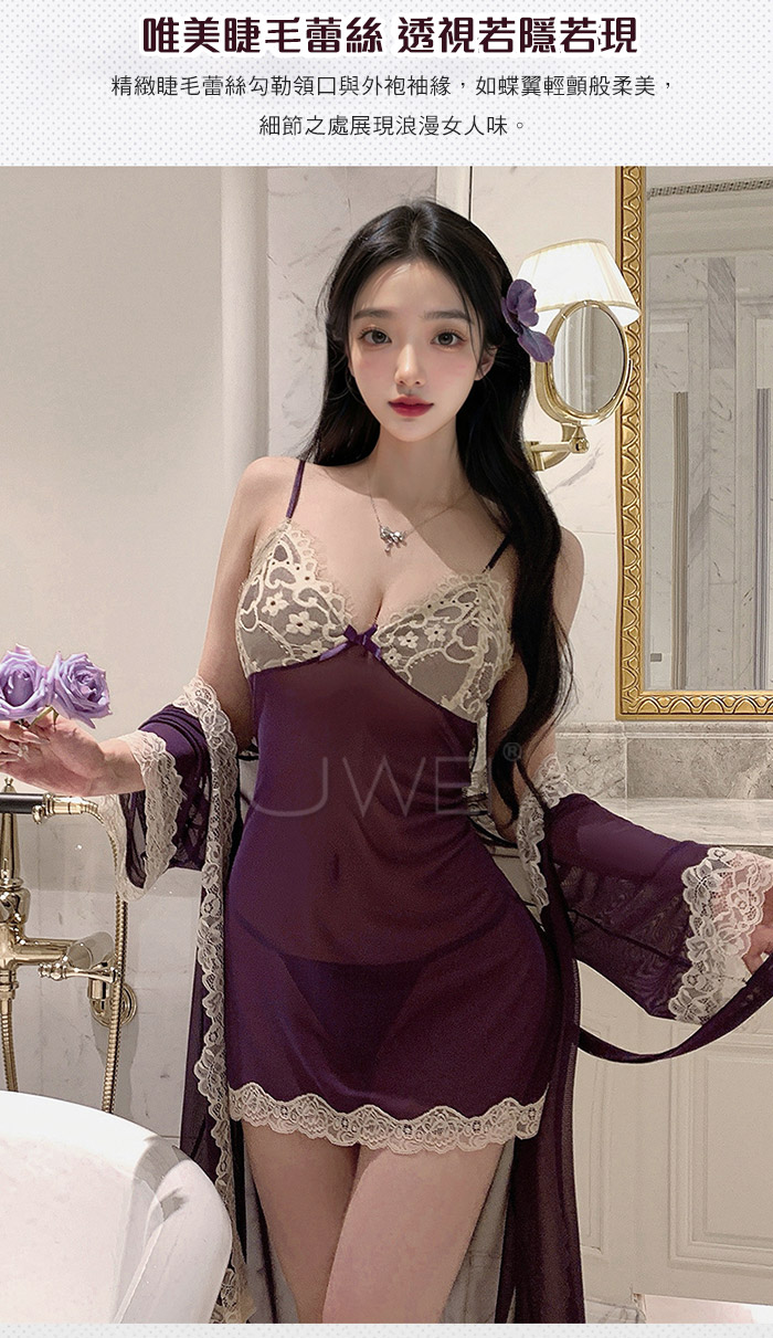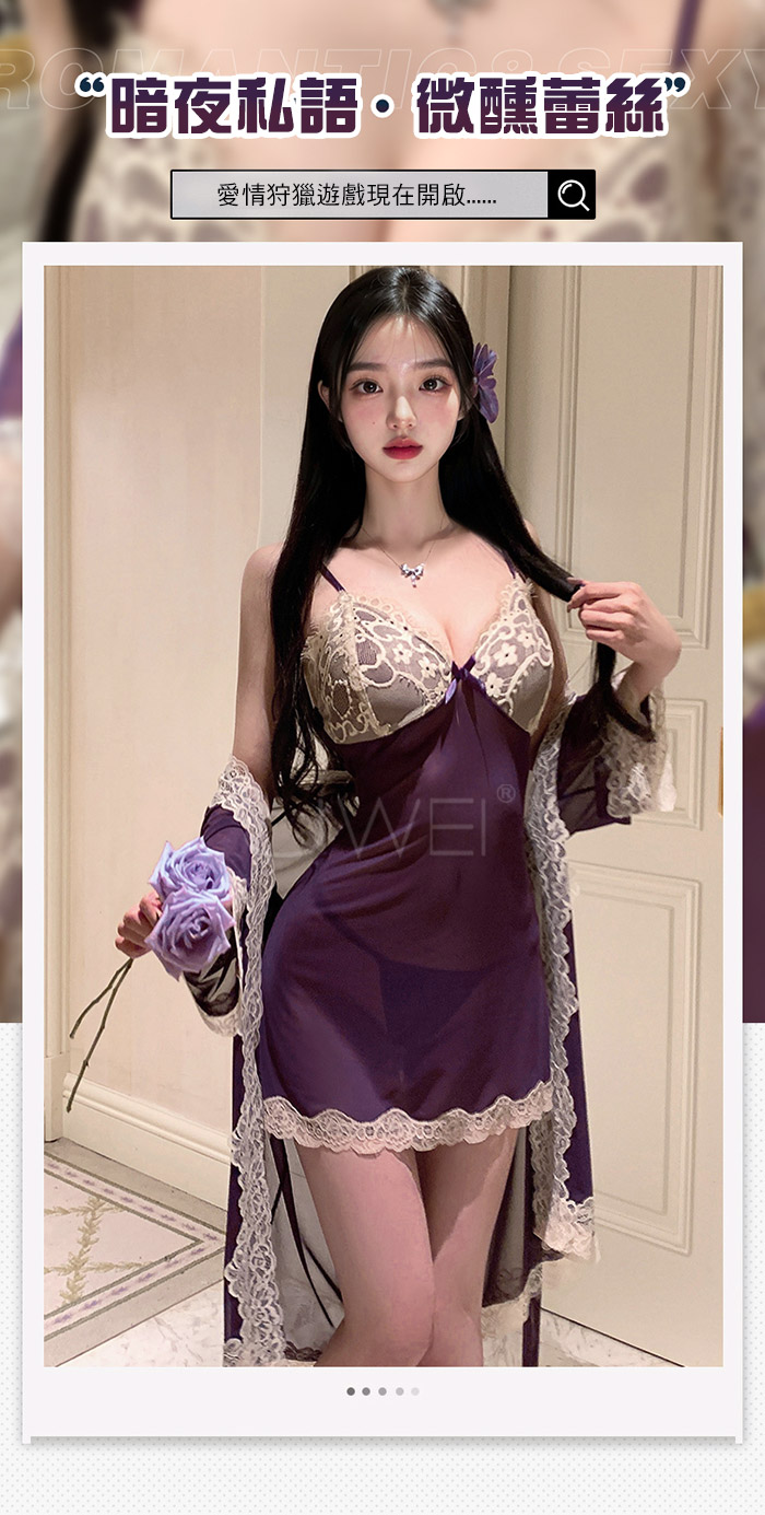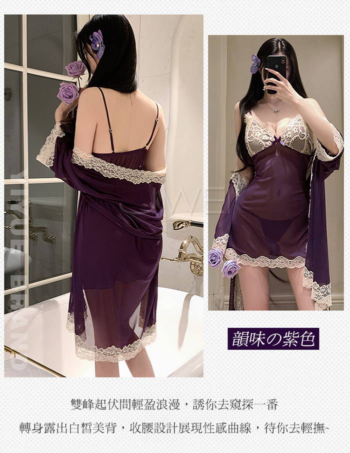| 微醺蕾絲.性感深V露溝睫毛蕾絲覆胸美背睡裙-紫色【外袍+睡裙+T褲】