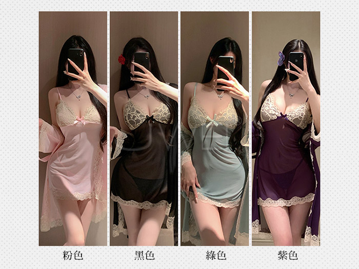| 微醺蕾絲.性感深V露溝睫毛蕾絲覆胸美背睡裙-黑色【外袍+睡裙+T褲】