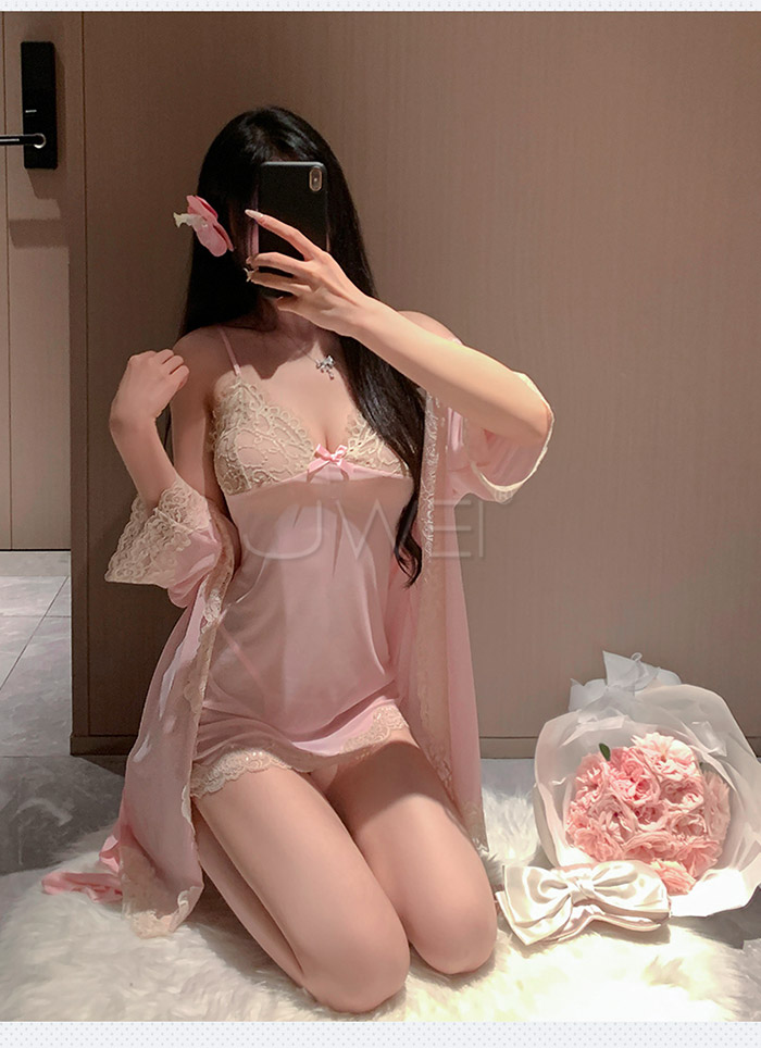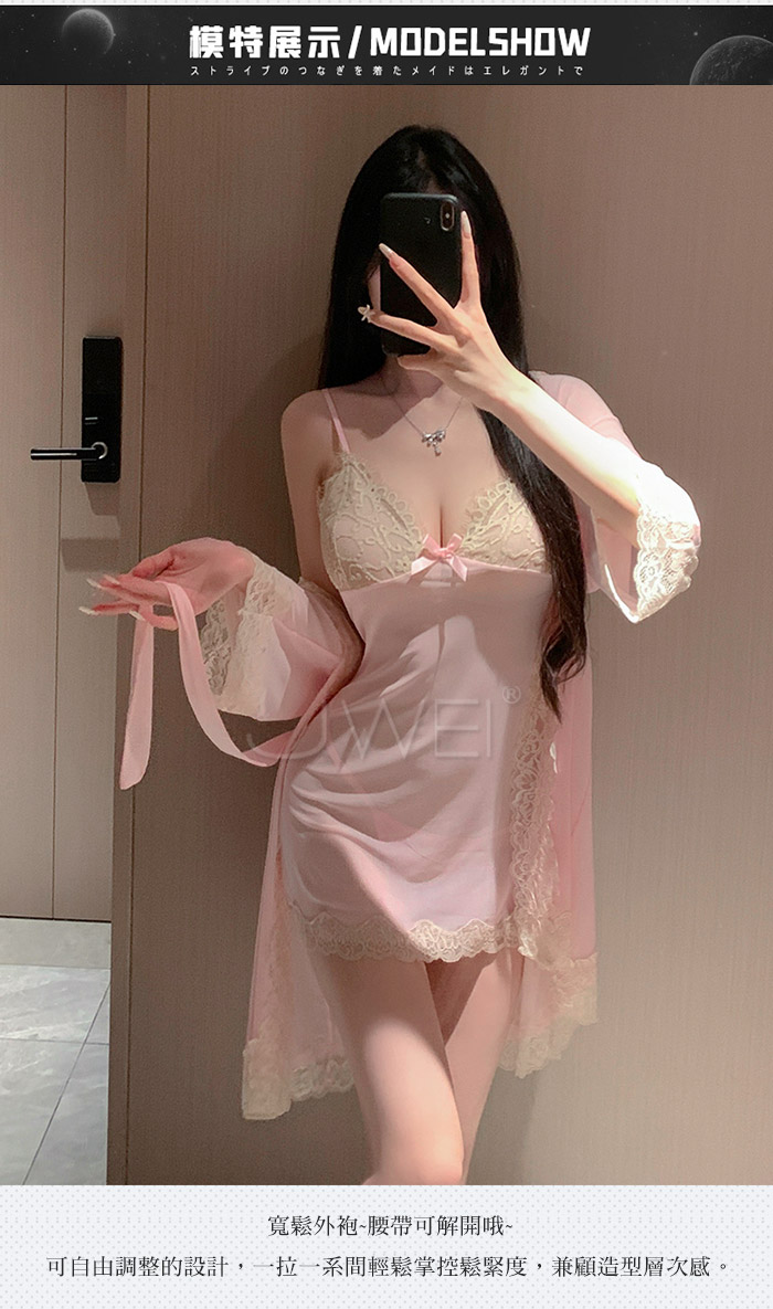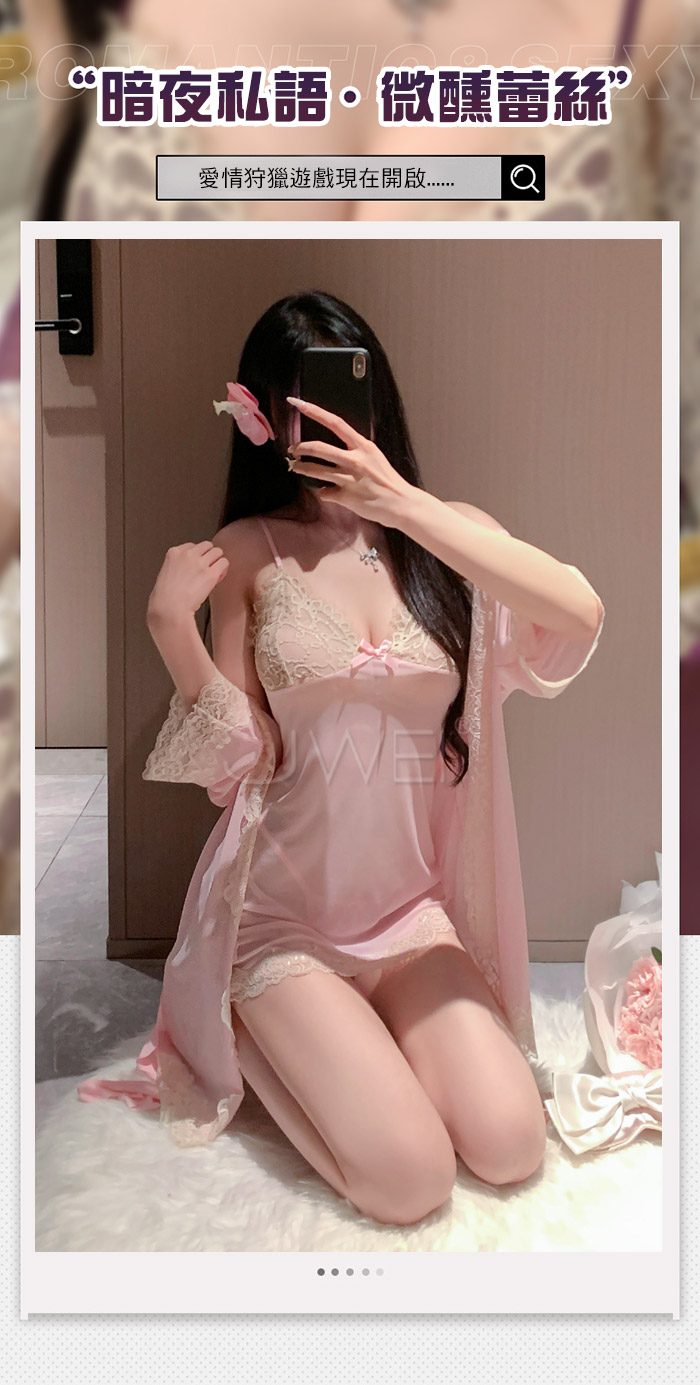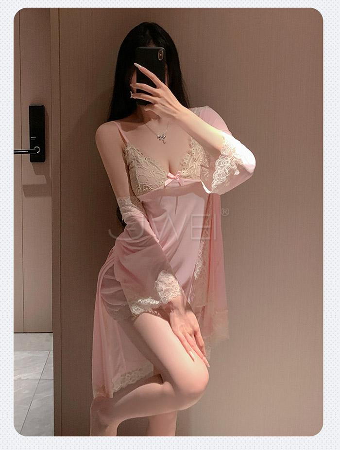 | 微醺蕾絲.性感深V露溝睫毛蕾絲覆胸美背睡裙-粉色【外袍+睡裙+T褲】