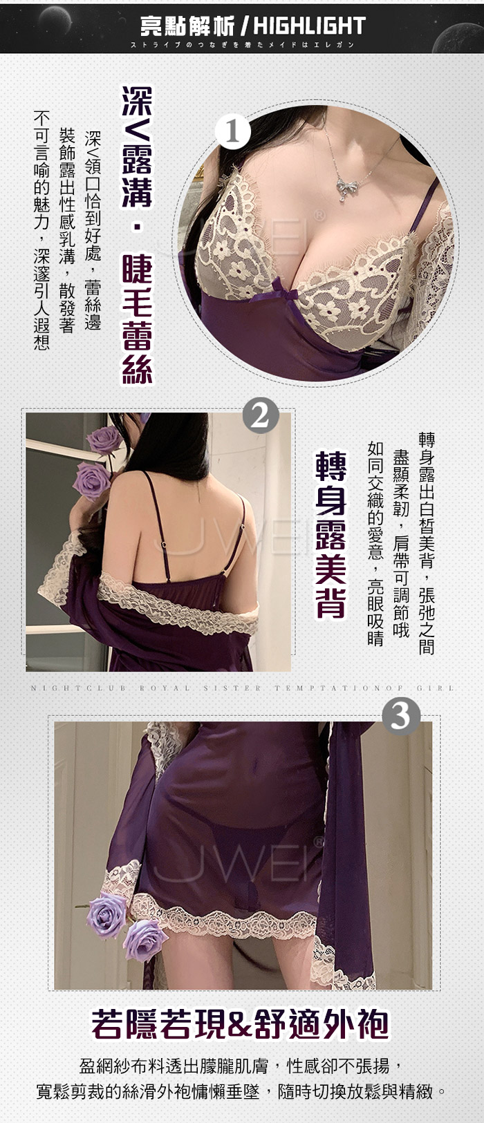 | 微醺蕾絲.性感深V露溝睫毛蕾絲覆胸美背睡裙-紫色【外袍+睡裙+T褲】